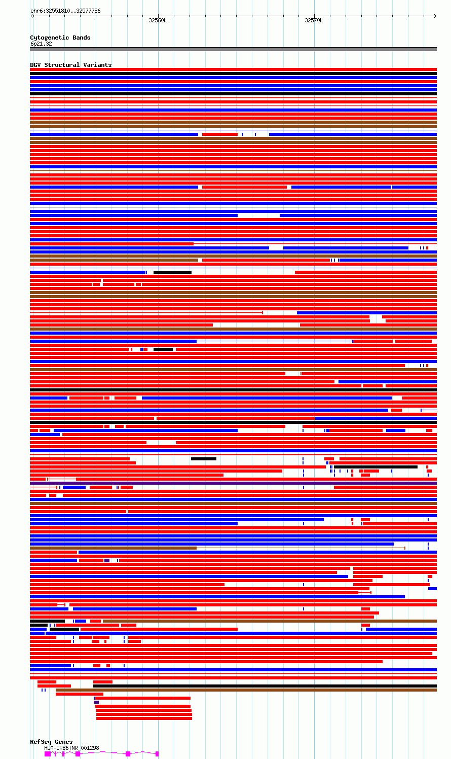 Variant DetailsVariant: essv6786387| Internal ID | 10191230 | | Landmark | | | Location Information | | | Cytoband | 6p21.32 | | Allele length | | Assembly | Allele length | | hg38 | 25977 | | hg19 | 25977 |