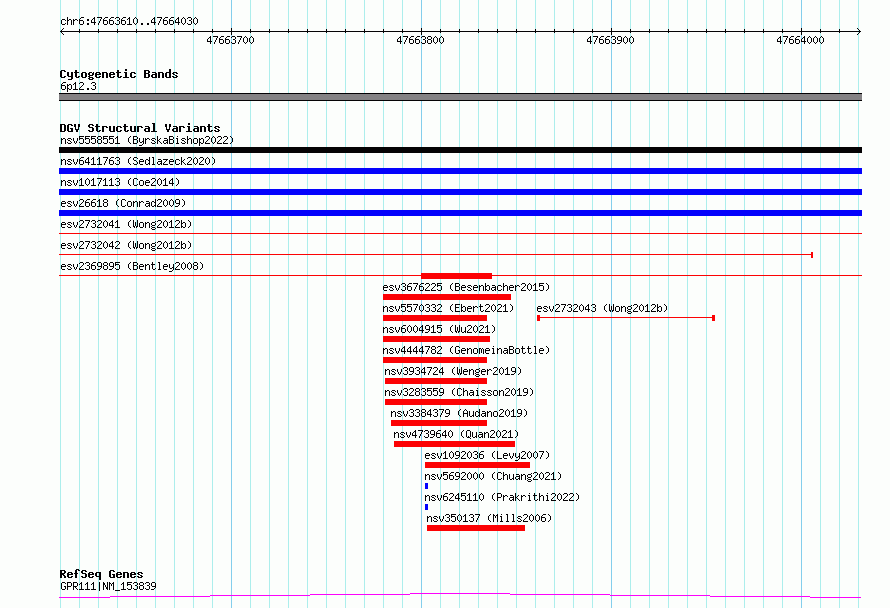 Variant DetailsVariant: essv6786413| Internal ID | 10191253 | | Landmark | | | Location Information | | | Cytoband | 6p12.3 | | Allele length | | Assembly | Allele length | | hg38 | 421 | | hg19 | 421 |