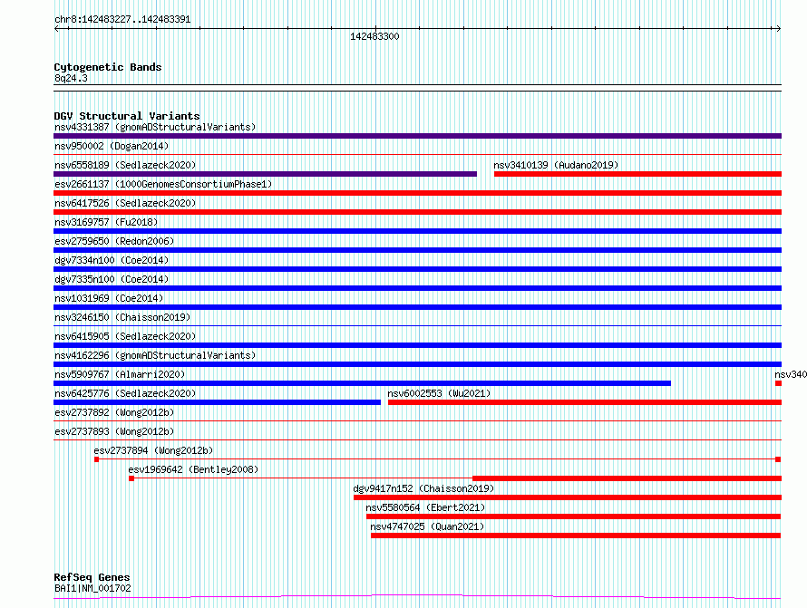 | | Variant Type | CNV deletion | | Copy Number | | | Allele State | | | Allele Origin | | | Probe Count | | | Validation Flag | | | Merged Status | S | | Merged Variants | esv2737892, esv2737893 | | Supporting Variants | | | Samples | SSM069 | | Known Genes | BAI1 | | Method | Sequencing | | Analysis | Breakdancer:4 times standard deviation,VariationHunter:4 times standard deviation and at least 3 supportting reads | | Platform | Illumina HiSeq 2000 | | Comments | | | Reference | Wong_et_al_2012b | | Pubmed ID | 23290073 | | Accession Number(s) | essv6787177