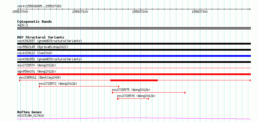 | | Variant Type | CNV deletion | | Copy Number | | | Allele State | | | Allele Origin | | | Probe Count | | | Validation Flag | | | Merged Status | S | | Merged Variants | esv2728570, esv2728571 | | Supporting Variants | | | Samples | SSM070 | | Known Genes | ASIC5 | | Method | Sequencing | | Analysis | Breakdancer:4 times standard deviation,VariationHunter:4 times standard deviation and at least 3 supportting reads | | Platform | Illumina HiSeq 2000 | | Comments | | | Reference | Wong_et_al_2012b | | Pubmed ID | 23290073 | | Accession Number(s) | essv6790124