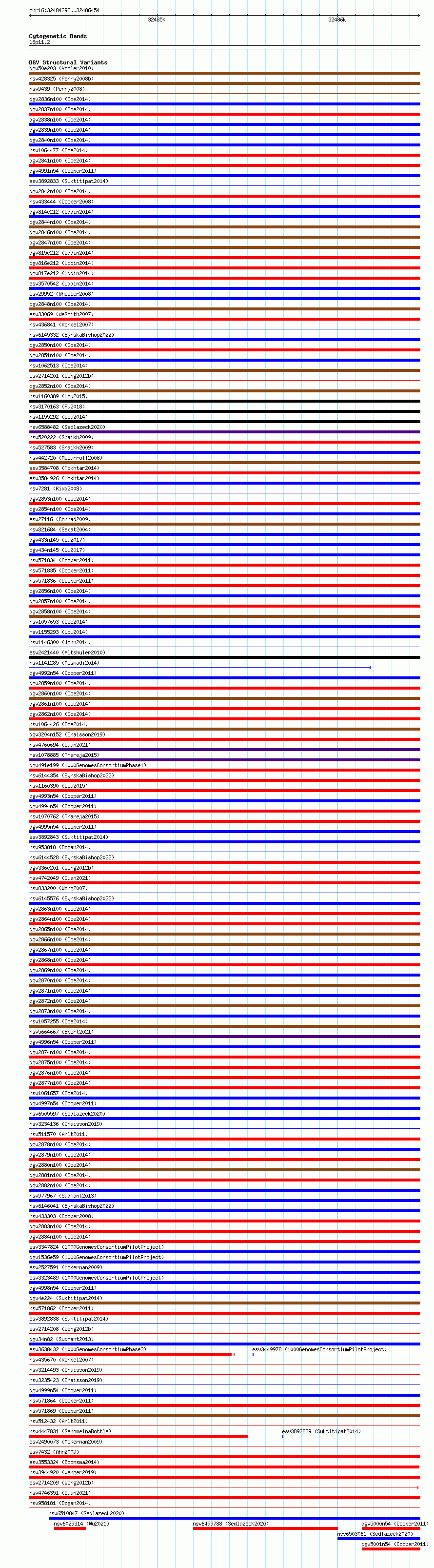Variant DetailsVariant: essv6792360| Internal ID | 10195786 | | Landmark | | | Location Information | | | Cytoband | 16p11.2 | | Allele length | | Assembly | Allele length | | hg38 | 2162 | | hg19 | 2162 |