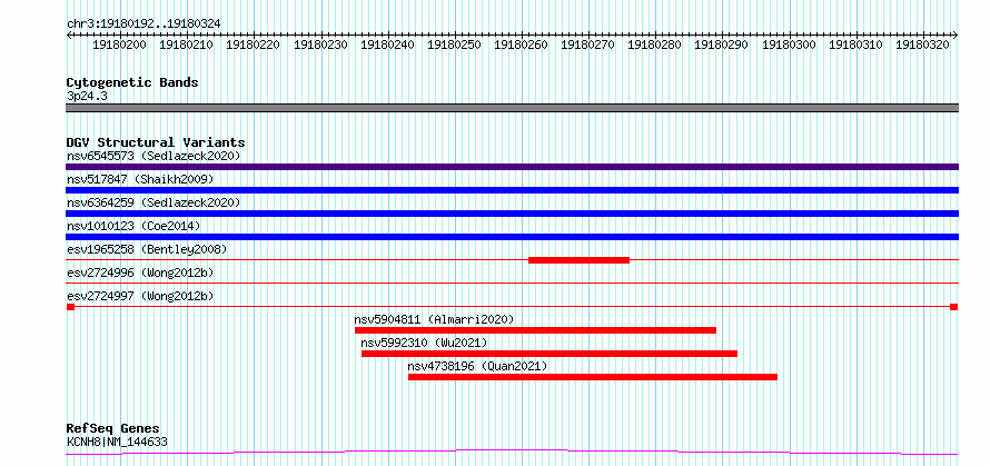 | | Variant Type | CNV deletion | | Copy Number | | | Allele State | | | Allele Origin | | | Probe Count | | | Validation Flag | | | Merged Status | S | | Merged Variants | esv2724996, esv2724997 | | Supporting Variants | | | Samples | SSM071 | | Known Genes | KCNH8 | | Method | Sequencing | | Analysis | Breakdancer:4 times standard deviation,VariationHunter:4 times standard deviation and at least 3 supportting reads | | Platform | Illumina HiSeq 2000 | | Comments | | | Reference | Wong_et_al_2012b | | Pubmed ID | 23290073 | | Accession Number(s) | essv6793840