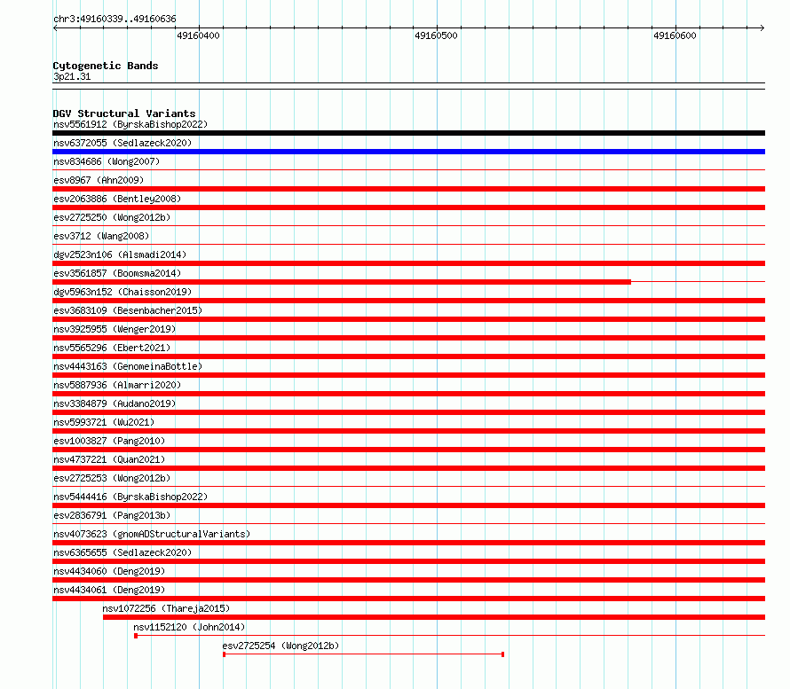 Variant DetailsVariant: essv6793867| Internal ID | 10200646 | | Landmark | | | Location Information | | | Cytoband | 3p21.31 | | Allele length | | Assembly | Allele length | | hg38 | 298 | | hg19 | 298 |
