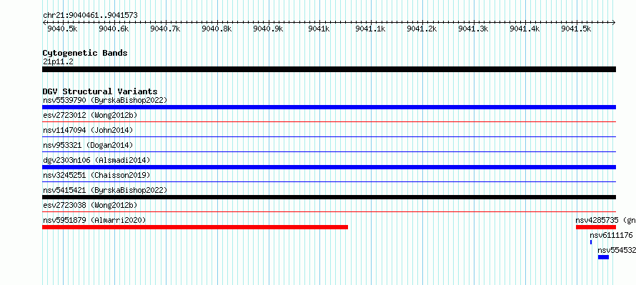 Variant DetailsVariant: essv6794042| Internal ID | 9983850 | | Landmark | | | Location Information | | | Cytoband | 21p11.2 | | Allele length | | Assembly | Allele length | | hg38 | 1113 | | hg19 | 1113 |