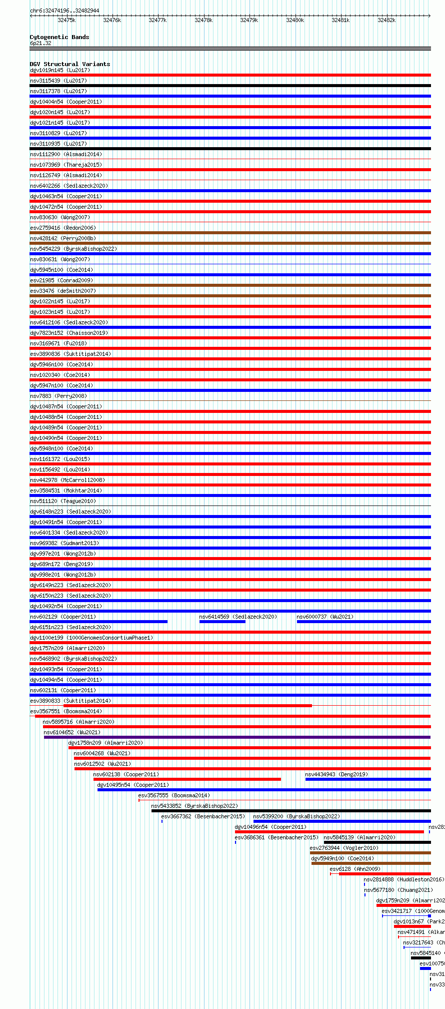 Variant DetailsVariant: essv6794876| Internal ID | 10005215 | | Landmark | | | Location Information | | | Cytoband | 6p21.32 | | Allele length | | Assembly | Allele length | | hg38 | 8749 | | hg19 | 8749 |