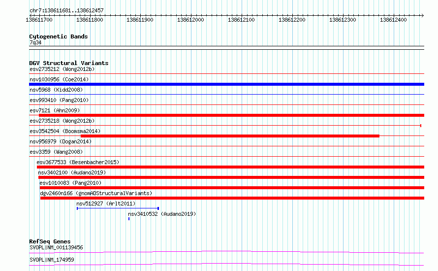 | | Variant Type | CNV deletion | | Copy Number | | | Allele State | | | Allele Origin | | | Probe Count | | | Validation Flag | | | Merged Status | S | | Merged Variants | esv2735218, esv2735212 | | Supporting Variants | | | Samples | SSM071 | | Known Genes | SVOPL | | Method | Sequencing | | Analysis | Breakdancer:4 times standard deviation,VariationHunter:4 times standard deviation and at least 3 supportting reads | | Platform | Illumina HiSeq 2000 | | Comments | | | Reference | Wong_et_al_2012b | | Pubmed ID | 23290073 | | Accession Number(s) | essv6795035