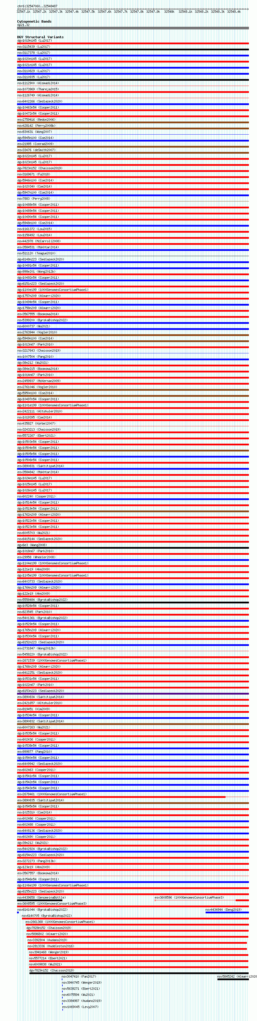 Variant DetailsVariant: essv6795065| Internal ID | 10005369 | | Landmark | | | Location Information | | | Cytoband | 6p21.32 | | Allele length | | Assembly | Allele length | | hg38 | 1428 | | hg19 | 1428 |