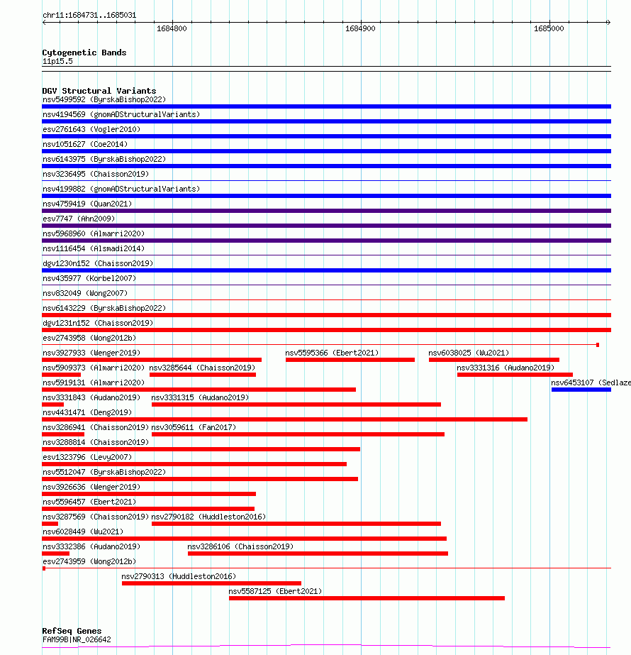 Variant DetailsVariant: essv6795844| Internal ID | 10199491 | | Landmark | | | Location Information | | | Cytoband | 11p15.5 | | Allele length | | Assembly | Allele length | | hg38 | 301 | | hg19 | 301 |