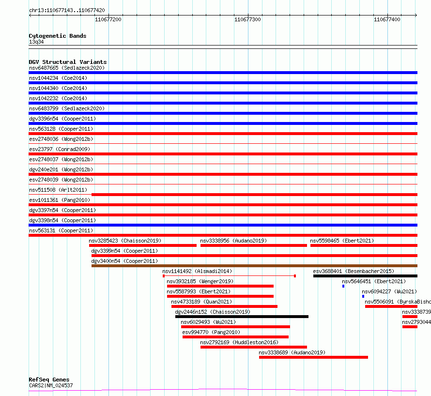 Variant DetailsVariant: essv6796241| Internal ID | 10199540 | | Landmark | | | Location Information | | | Cytoband | 13q34 | | Allele length | | Assembly | Allele length | | hg38 | 278 | | hg19 | 278 |