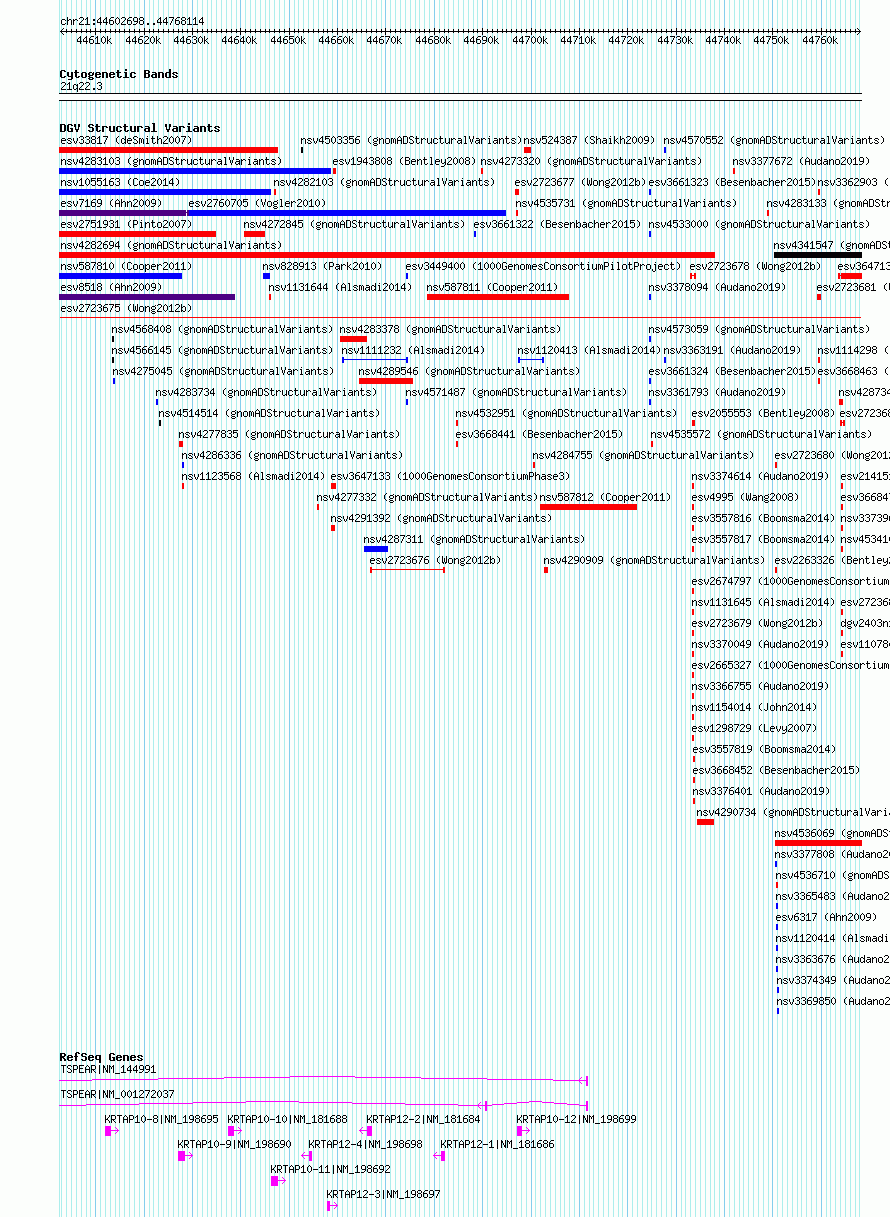 | | Variant Type | CNV deletion | | Copy Number | | | Allele State | | | Allele Origin | | | Probe Count | | | Validation Flag | | | Merged Status | S | | Merged Variants | esv2723675 | | Supporting Variants | | | Samples | SSM071 | | Known Genes | KRTAP10-10, KRTAP10-11, KRTAP10-12, KRTAP10-8, KRTAP10-9, KRTAP12-1, KRTAP12-2, KRTAP12-3, KRTAP12-4, TSPEAR | | Method | Sequencing | | Analysis | Breakdancer:4 times standard deviation,VariationHunter:4 times standard deviation and at least 3 supportting reads | | Platform | Illumina HiSeq 2000 | | Comments | | | Reference | Wong_et_al_2012b | | Pubmed ID | 23290073 | | Accession Number(s) | essv6797363