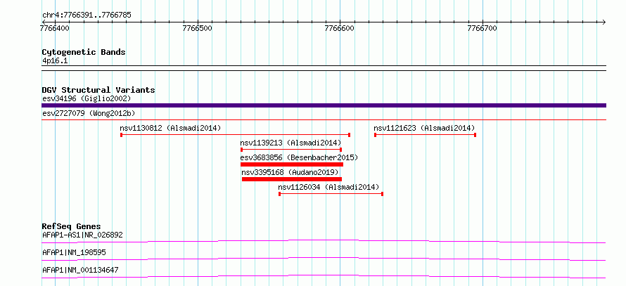 Variant DetailsVariant: essv6798252| Internal ID | 9857884 | | Landmark | | | Location Information | | | Cytoband | 4p16.1 | | Allele length | | Assembly | Allele length | | hg38 | 395 | | hg19 | 395 |