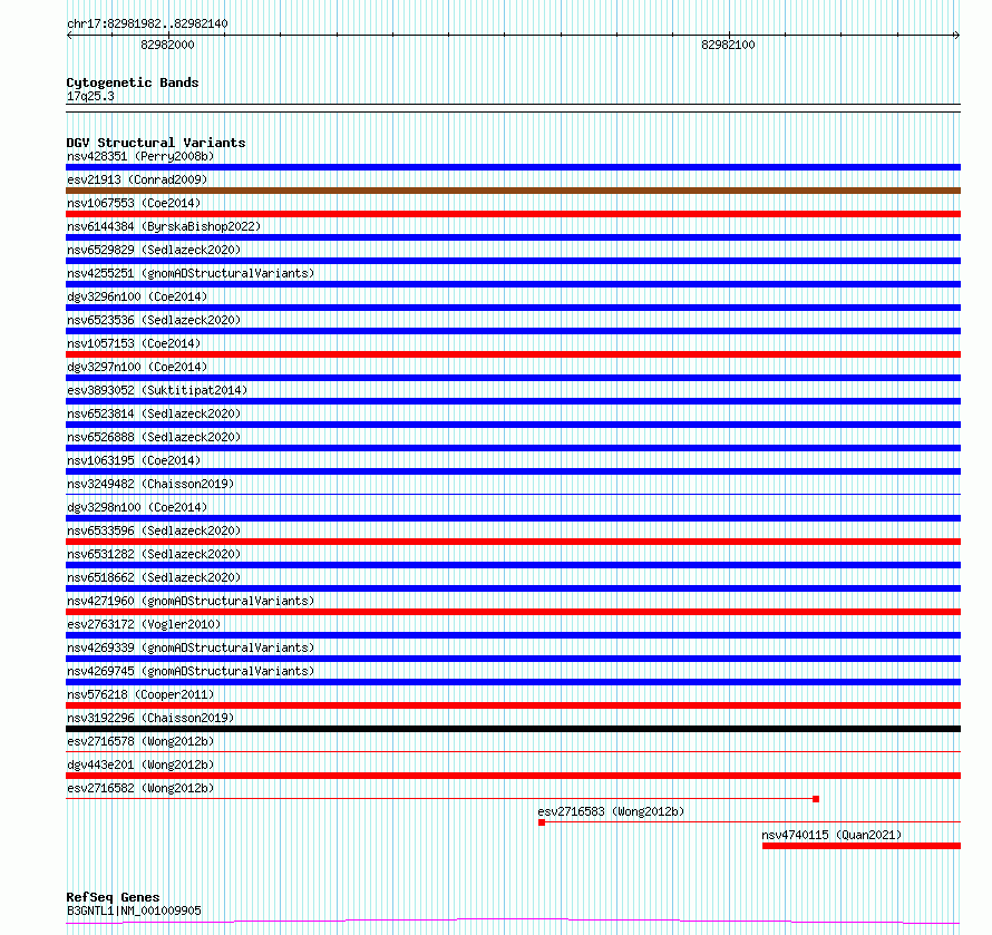 | | Variant Type | CNV deletion | | Copy Number | | | Allele State | | | Allele Origin | | | Probe Count | | | Validation Flag | | | Merged Status | S | | Merged Variants | esv2716578, esv2716579, esv2716581, esv2716580, esv2716582 | | Supporting Variants | | | Samples | SSM072 | | Known Genes | B3GNTL1 | | Method | Sequencing | | Analysis | Breakdancer:4 times standard deviation,VariationHunter:4 times standard deviation and at least 3 supportting reads | | Platform | Illumina HiSeq 2000 | | Comments | | | Reference | Wong_et_al_2012b | | Pubmed ID | 23290073 | | Accession Number(s) | essv6801037