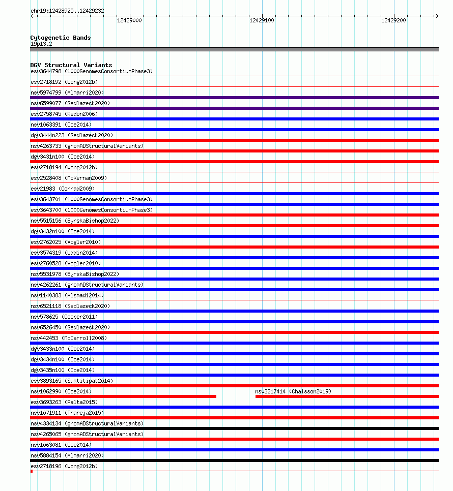 Variant DetailsVariant: essv6801289| Internal ID | 10203526 | | Landmark | | | Location Information | | | Cytoband | 19p13.2 | | Allele length | | Assembly | Allele length | | hg38 | 308 | | hg19 | 308 |