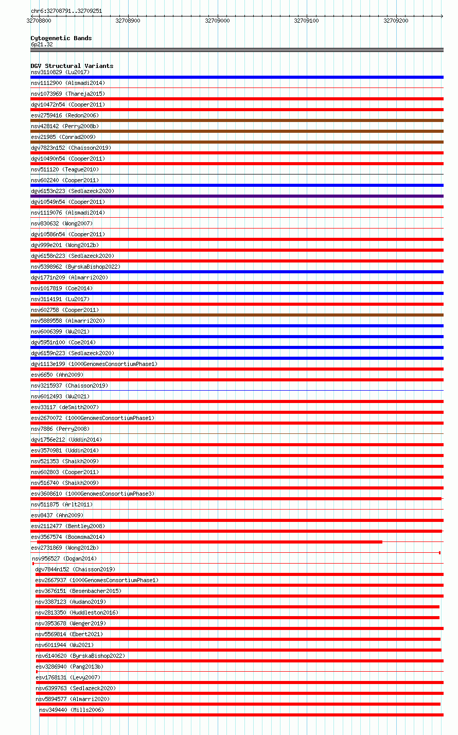 Variant DetailsVariant: essv6802570| Internal ID | 10207341 | | Landmark | | | Location Information | | | Cytoband | 6p21.32 | | Allele length | | Assembly | Allele length | | hg38 | 461 | | hg19 | 461 |