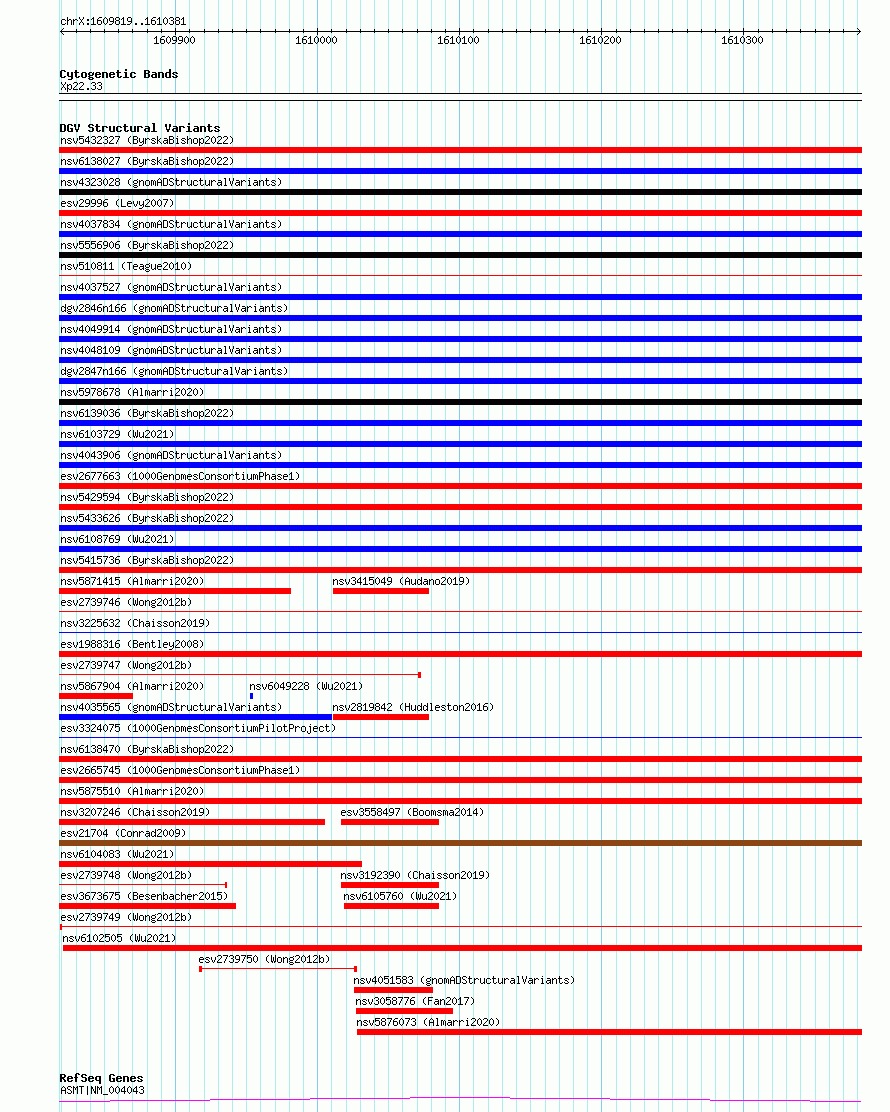 Variant DetailsVariant: essv6802916| Internal ID | 10205450 | | Landmark | | | Location Information | | | Cytoband | Xp22.33 | | Allele length | | Assembly | Allele length | | hg38 | 563 | | hg19 | 563 |
