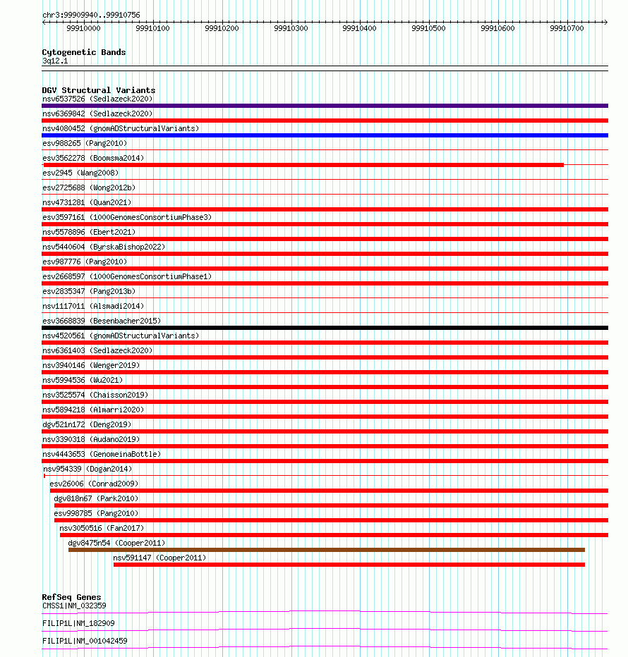 Variant DetailsVariant: essv6804875| Internal ID | 10210020 | | Landmark | | | Location Information | | | Cytoband | 3q12.1 | | Allele length | | Assembly | Allele length | | hg38 | 817 | | hg19 | 817 |