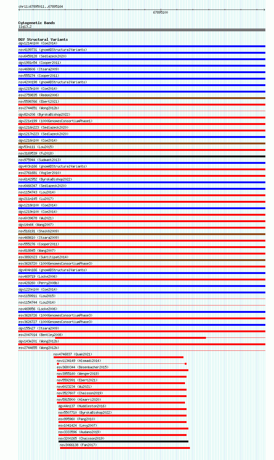 Variant DetailsVariant: essv6806288| Internal ID | 10207949 | | Landmark | | | Location Information | | | Cytoband | 11q13.2 | | Allele length | | Assembly | Allele length | | hg38 | 154 | | hg19 | 154 |