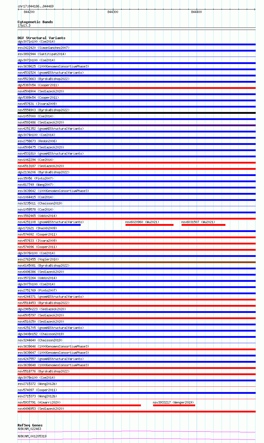 Variant DetailsVariant: essv6806841| Internal ID | 10208653 | | Landmark | | | Location Information | | | Cytoband | 17p13.3 | | Allele length | | Assembly | Allele length | | hg38 | 284 | | hg19 | 284 |