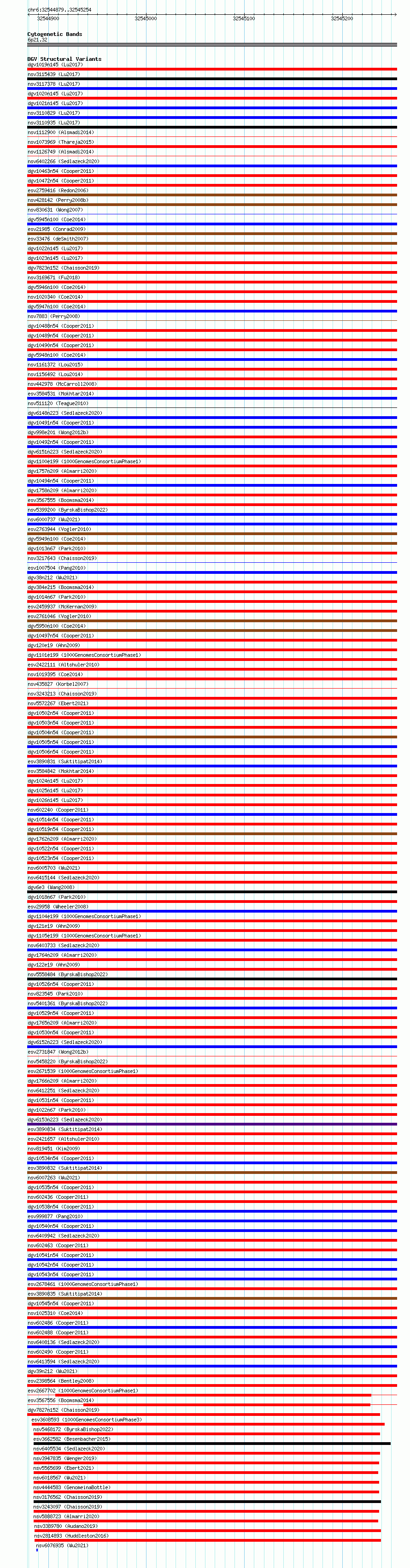 Variant DetailsVariant: essv6808391| Internal ID | 10212626 | | Landmark | | | Location Information | | | Cytoband | 6p21.32 | | Allele length | | Assembly | Allele length | | hg38 | 376 | | hg19 | 376 |