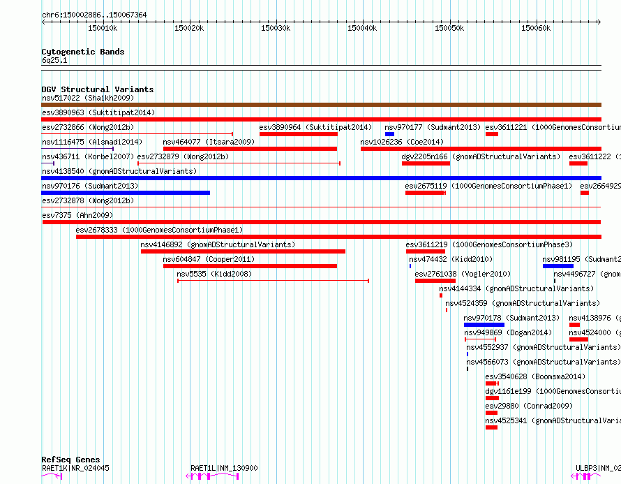 Variant DetailsVariant: essv6808525| Internal ID | 9866061 | | Landmark | | | Location Information | | | Cytoband | 6q25.1 | | Allele length | | Assembly | Allele length | | hg38 | 64479 | | hg19 | 64479 |