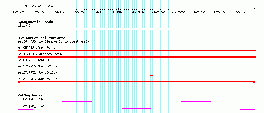 | | Variant Type | CNV deletion | | Copy Number | | | Allele State | | | Allele Origin | | | Probe Count | | | Validation Flag | | | Merged Status | S | | Merged Variants | esv2717950, esv2717953 | | Supporting Variants | | | Samples | SSM075 | | Known Genes | TBXA2R | | Method | Sequencing | | Analysis | Breakdancer:4 times standard deviation,VariationHunter:4 times standard deviation and at least 3 supportting reads | | Platform | Illumina HiSeq 2000 | | Comments | | | Reference | Wong_et_al_2012b | | Pubmed ID | 23290073 | | Accession Number(s) | essv6810106