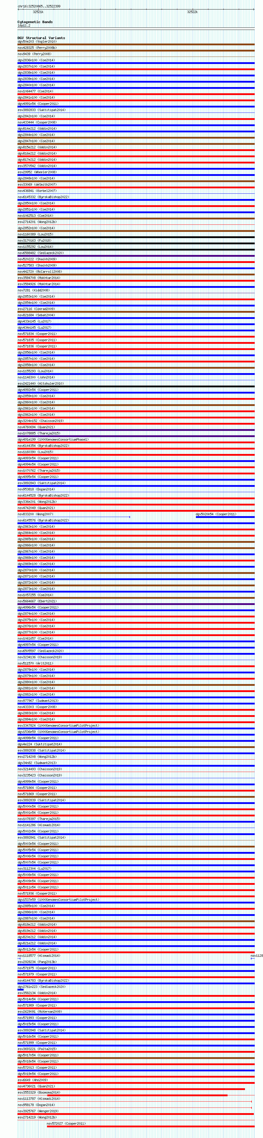 Variant DetailsVariant: essv6810143| Internal ID | 10004211 | | Landmark | | | Location Information | | | Cytoband | 16p11.2 | | Allele length | | Assembly | Allele length | | hg38 | 1535 | | hg19 | 1535 |