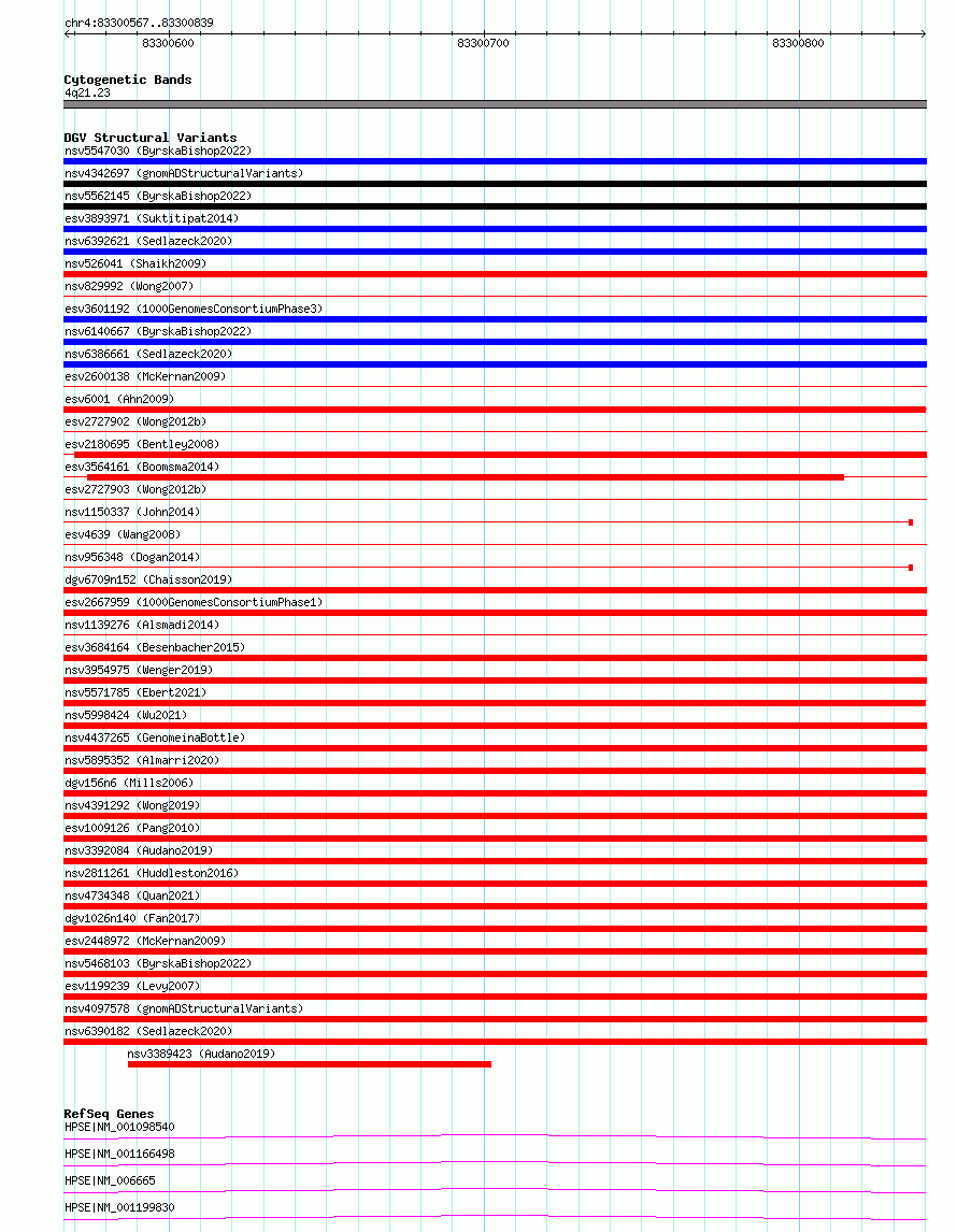 Variant DetailsVariant: essv6810938| Internal ID | 10213646 | | Landmark | | | Location Information | | | Cytoband | 4q21.23 | | Allele length | | Assembly | Allele length | | hg38 | 273 | | hg19 | 273 |