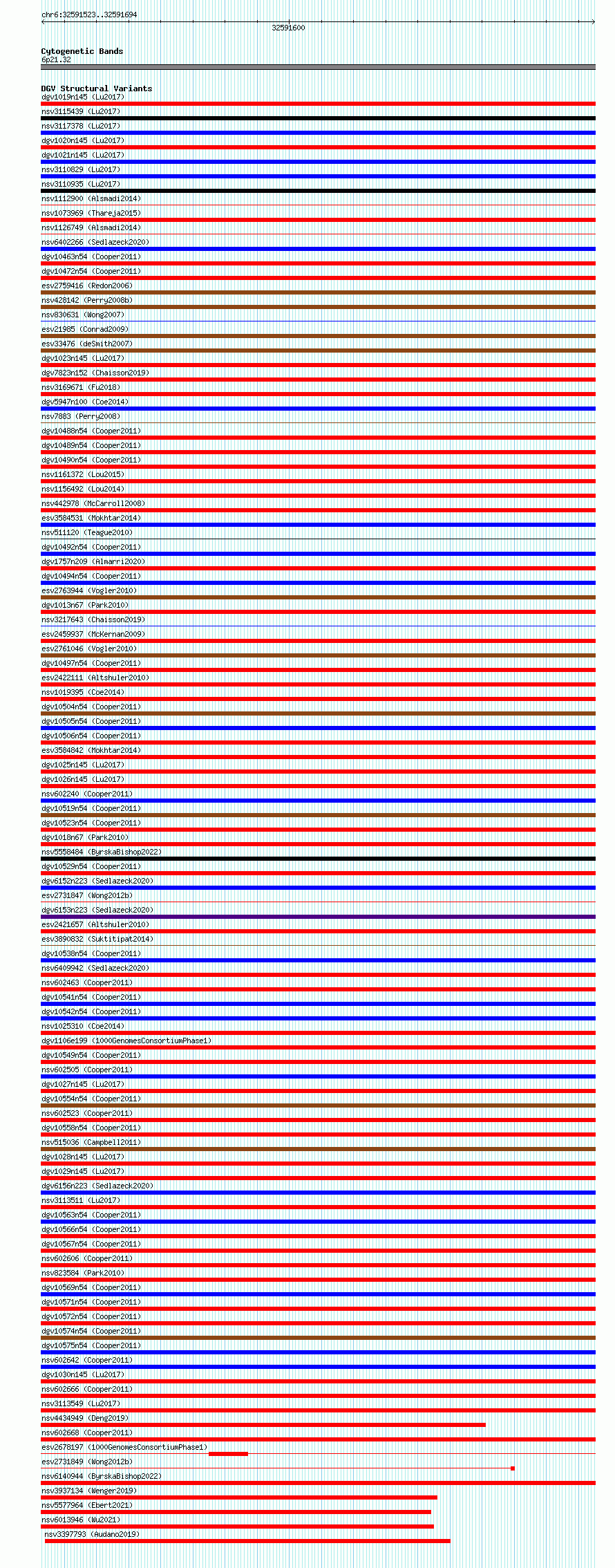 Variant DetailsVariant: essv6811298| Internal ID | 10214308 | | Landmark | | | Location Information | | | Cytoband | 6p21.32 | | Allele length | | Assembly | Allele length | | hg38 | 172 | | hg19 | 172 |