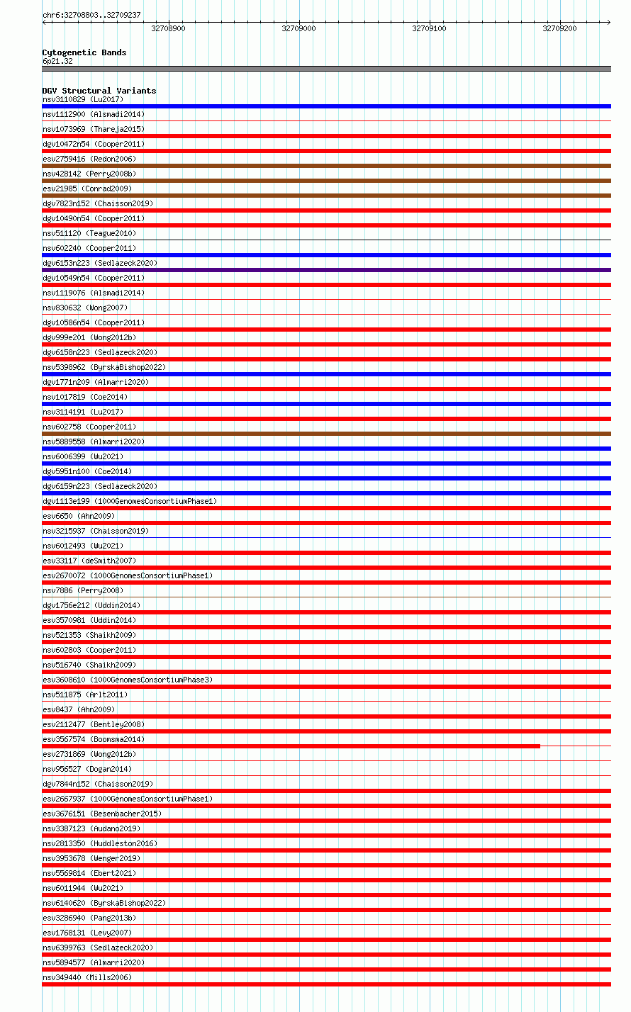 Variant DetailsVariant: essv6811313| Internal ID | 10214321 | | Landmark | | | Location Information | | | Cytoband | 6p21.32 | | Allele length | | Assembly | Allele length | | hg38 | 435 | | hg19 | 435 |