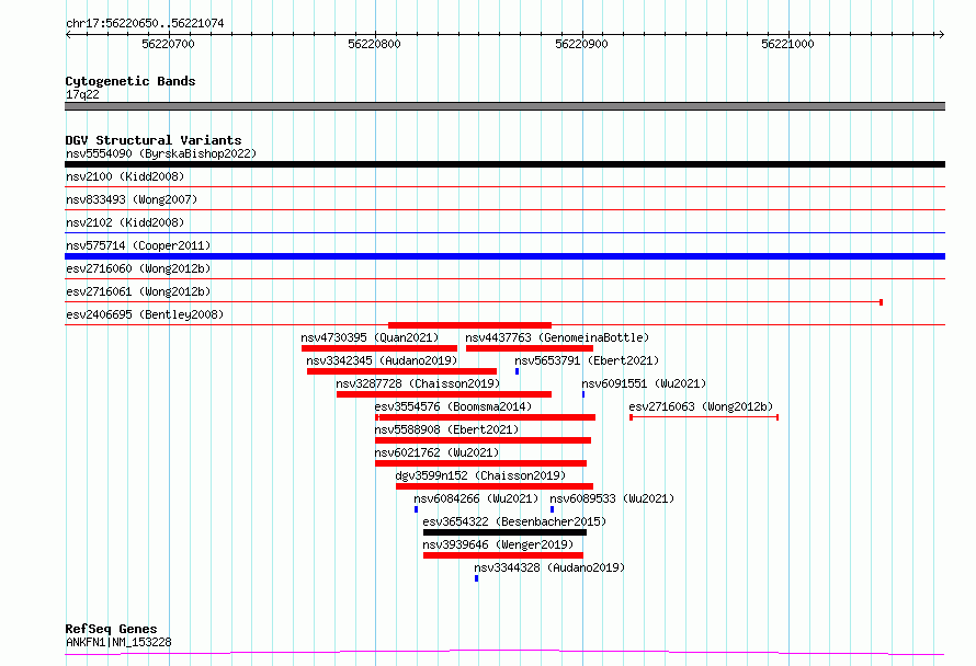 Variant DetailsVariant: essv6811632| Internal ID | 10004519 | | Landmark | | | Location Information | | | Cytoband | 17q22 | | Allele length | | Assembly | Allele length | | hg38 | 425 | | hg19 | 425 |