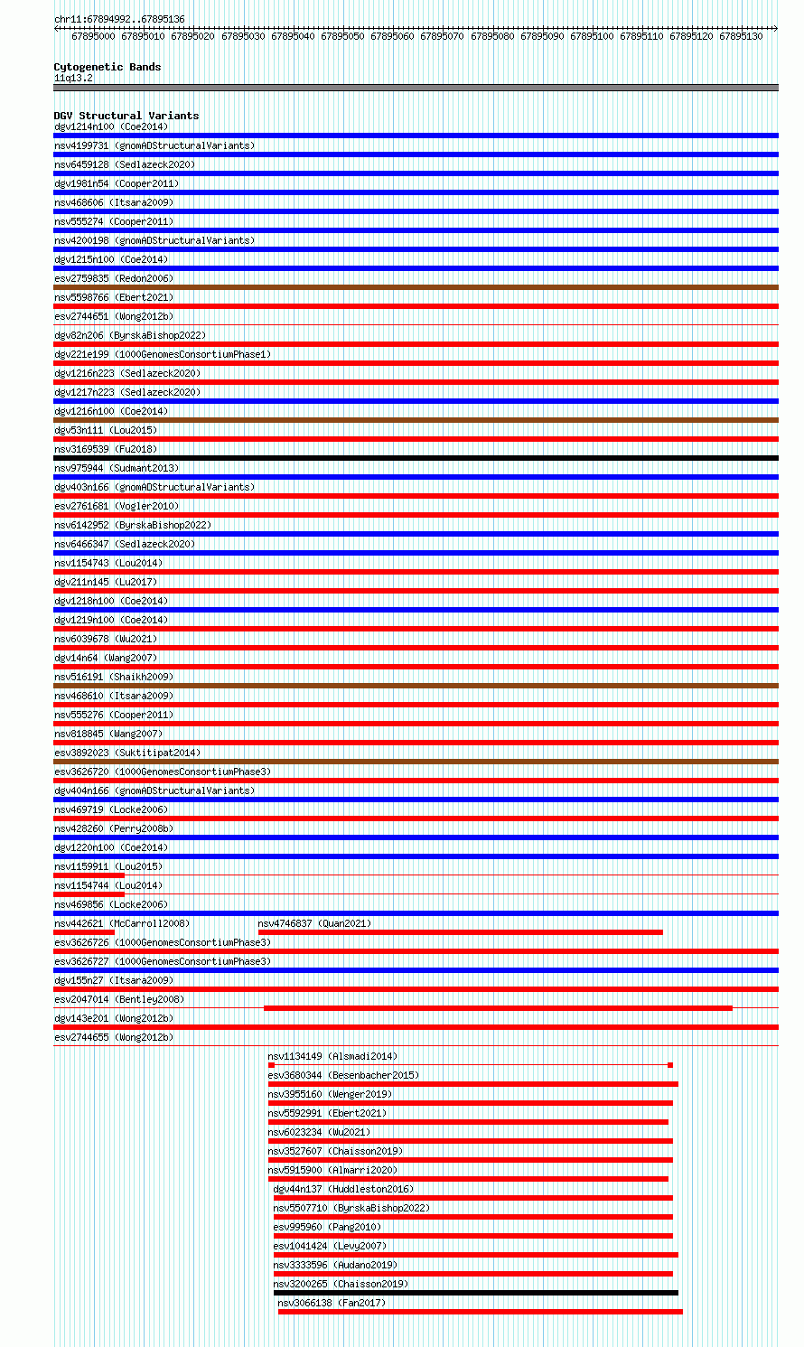 Variant DetailsVariant: essv6812137| Internal ID | 10215063 | | Landmark | | | Location Information | | | Cytoband | 11q13.2 | | Allele length | | Assembly | Allele length | | hg38 | 145 | | hg19 | 145 |