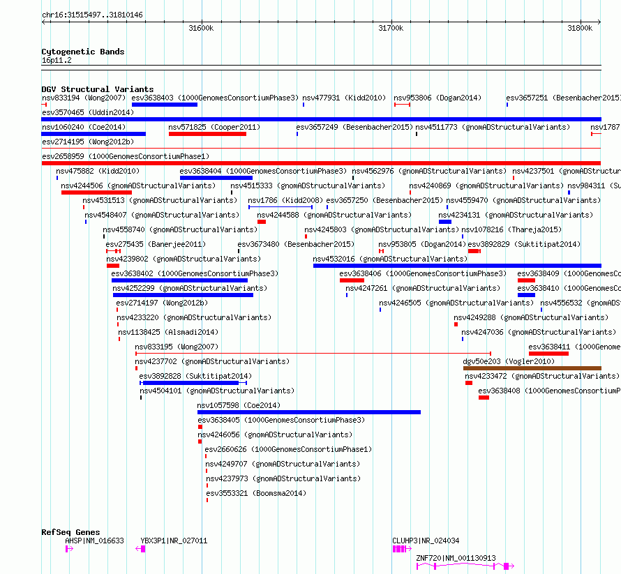 Variant DetailsVariant: essv6812583| Internal ID | 9866244 | | Landmark | | | Location Information | | | Cytoband | 16p11.2 | | Allele length | | Assembly | Allele length | | hg38 | 294650 | | hg19 | 294650 |