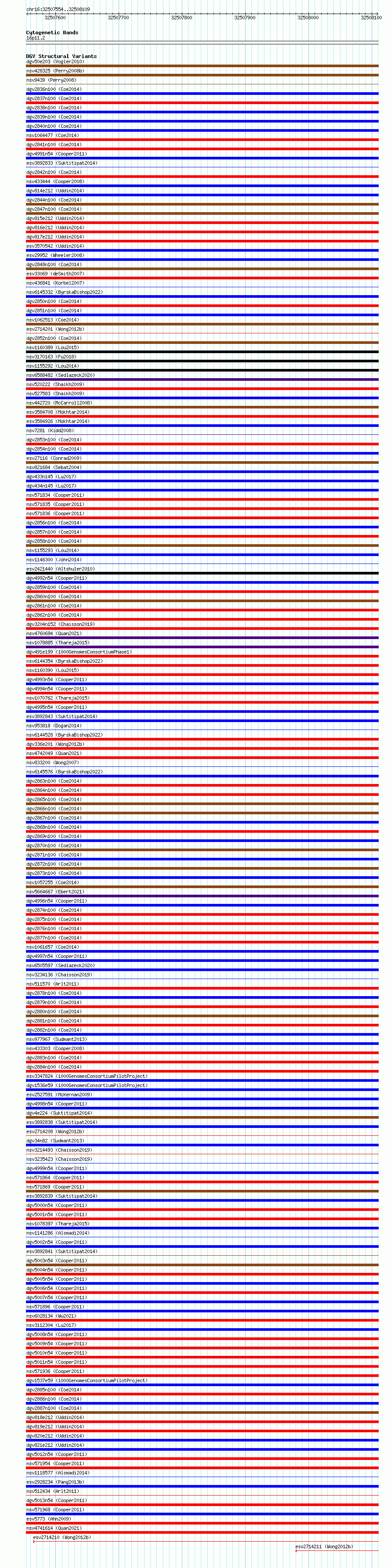Variant DetailsVariant: essv6812586| Internal ID | 10212933 | | Landmark | | | Location Information | | | Cytoband | 16p11.2 | | Allele length | | Assembly | Allele length | | hg38 | 556 | | hg19 | 556 |