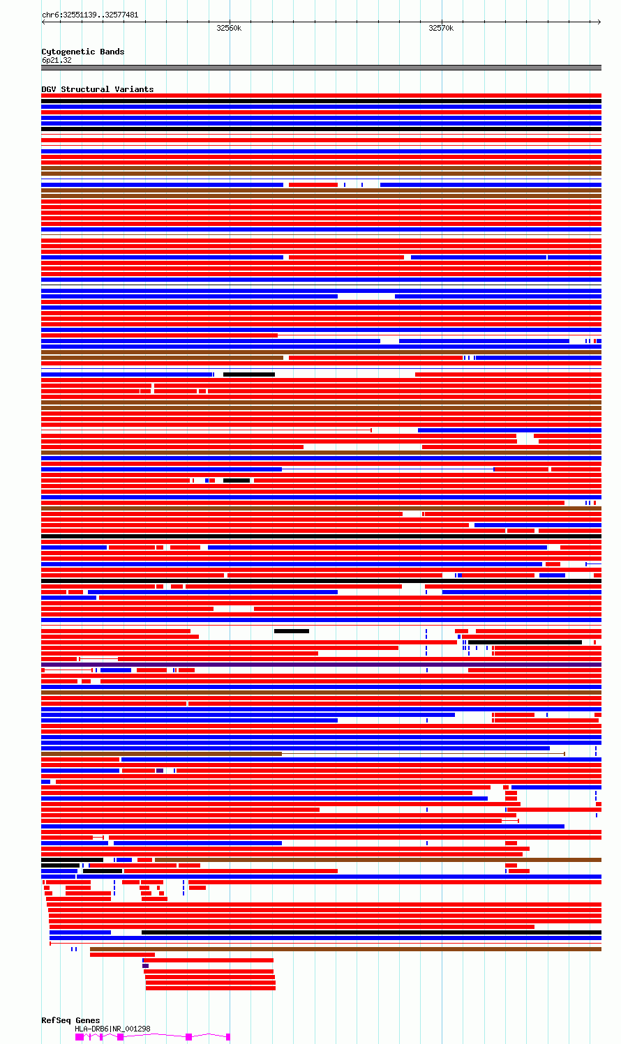 Variant DetailsVariant: essv6814309| Internal ID | 10216360 | | Landmark | | | Location Information | | | Cytoband | 6p21.32 | | Allele length | | Assembly | Allele length | | hg38 | 26343 | | hg19 | 26343 |
