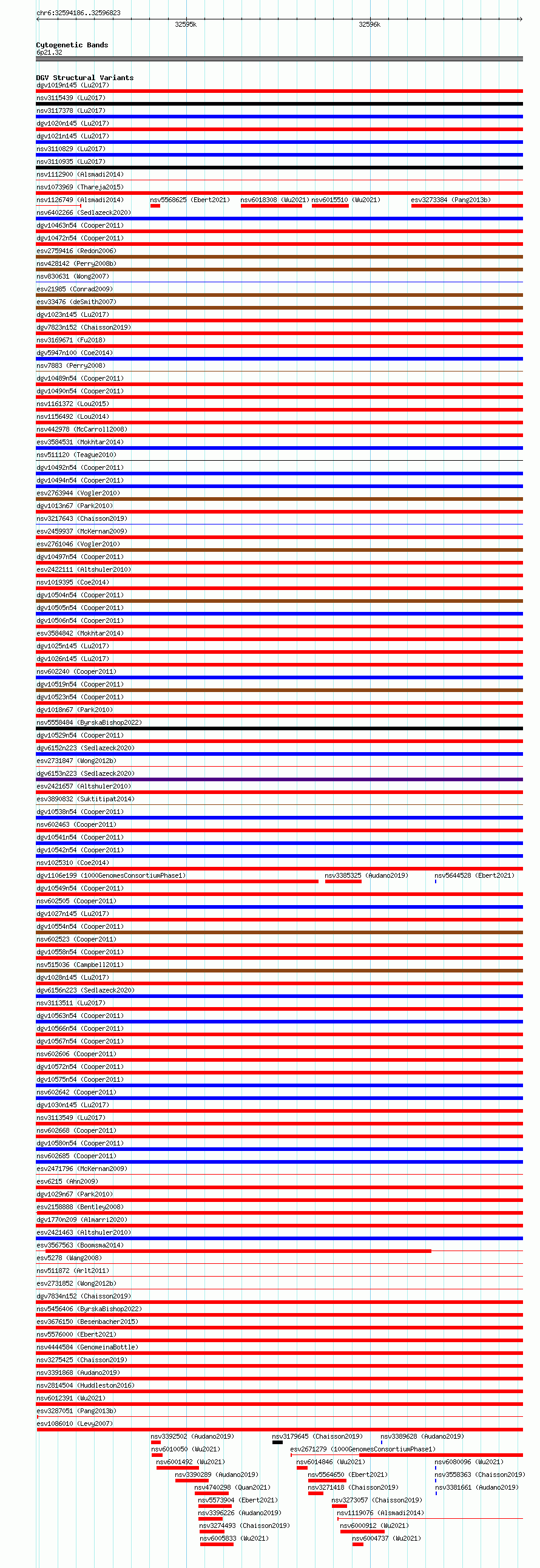 Variant DetailsVariant: essv6814318| Internal ID | 10216368 | | Landmark | | | Location Information | | | Cytoband | 6p21.32 | | Allele length | | Assembly | Allele length | | hg38 | 2638 | | hg19 | 2638 |