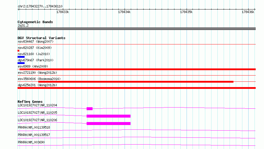 | Variant Type | CNV deletion | Copy Number | | Allele State | | Allele Origin | | Probe Count | | Validation Flag | | Merged Status | S | Merged Variants | esv2721190 | Supporting Variants | | Samples | SSM078 | Known Genes | MIR548N, PRKRA | Method | Sequencing | Analysis | Breakdancer:4 times standard deviation,VariationHunter:4 times standard deviation and at least 3 supportting reads | Platform | Illumina HiSeq 2000 | Comments | | Reference | Wong_et_al_2012b | Pubmed ID | 23290073 | Accession Number(s) | essv6817092