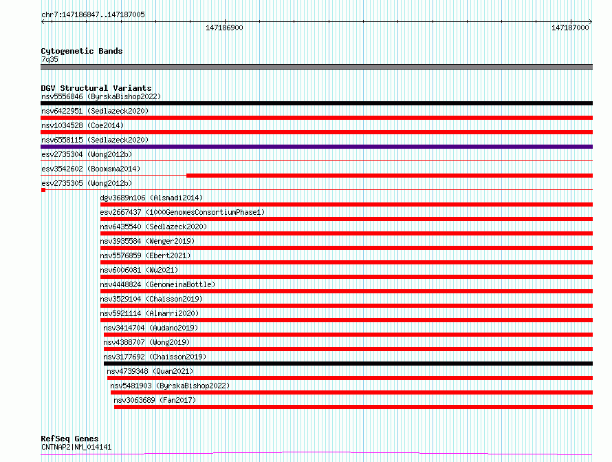 | | Variant Type | CNV deletion | | Copy Number | | | Allele State | | | Allele Origin | | | Probe Count | | | Validation Flag | | | Merged Status | S | | Merged Variants | esv2735304, esv2735305 | | Supporting Variants | | | Samples | SSM078 | | Known Genes | CNTNAP2 | | Method | Sequencing | | Analysis | Breakdancer:4 times standard deviation,VariationHunter:4 times standard deviation and at least 3 supportting reads | | Platform | Illumina HiSeq 2000 | | Comments | | | Reference | Wong_et_al_2012b | | Pubmed ID | 23290073 | | Accession Number(s) | essv6818671