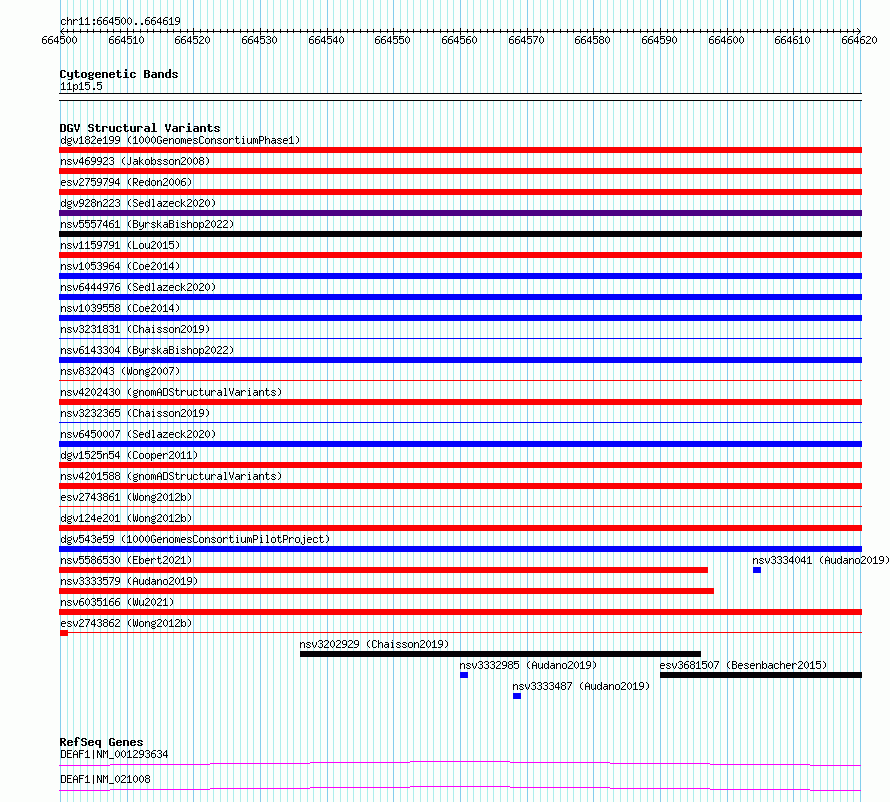 Variant DetailsVariant: essv6819465| Internal ID | 10219124 | | Landmark | | | Location Information | | | Cytoband | 11p15.5 | | Allele length | | Assembly | Allele length | | hg38 | 120 | | hg19 | 120 |