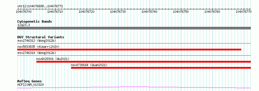 Variant DetailsVariant: essv6819777| Internal ID | 10219404 | | Landmark | | | Location Information | | | Cytoband | 12q23.3 | | Allele length | | Assembly | Allele length | | hg38 | 74 | | hg19 | 74 |