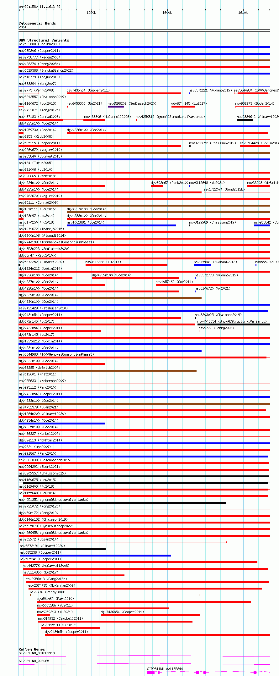 Variant DetailsVariant: essv6820680| Internal ID | 10220218 | | Landmark | | | Location Information | | | Cytoband | 20p13 | | Allele length | | Assembly | Allele length | | hg38 | 33069 | | hg19 | 33069 |