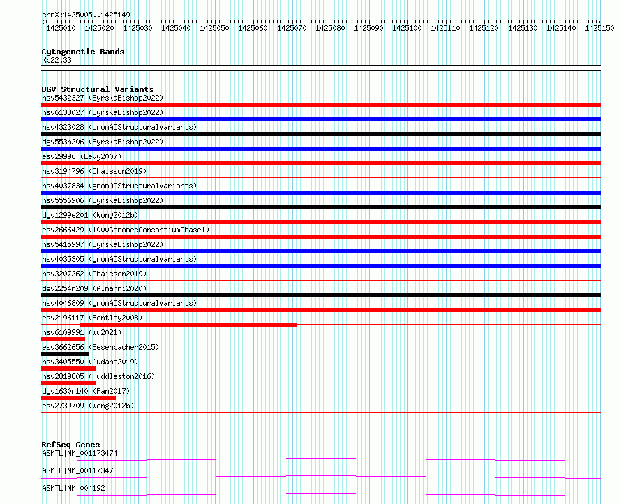 Variant DetailsVariant: essv6822866| Internal ID | 10224061 | | Landmark | | | Location Information | | | Cytoband | Xp22.33 | | Allele length | | Assembly | Allele length | | hg38 | 145 | | hg19 | 145 |