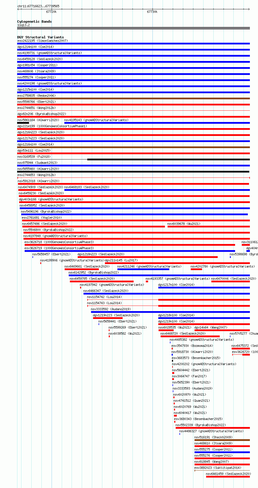 Variant DetailsVariant: essv6823530| Internal ID | 10224659 | | Landmark | | | Location Information | | | Cytoband | 11q13.2 | | Allele length | | Assembly | Allele length | | hg38 | 22943 | | hg19 | 22943 |