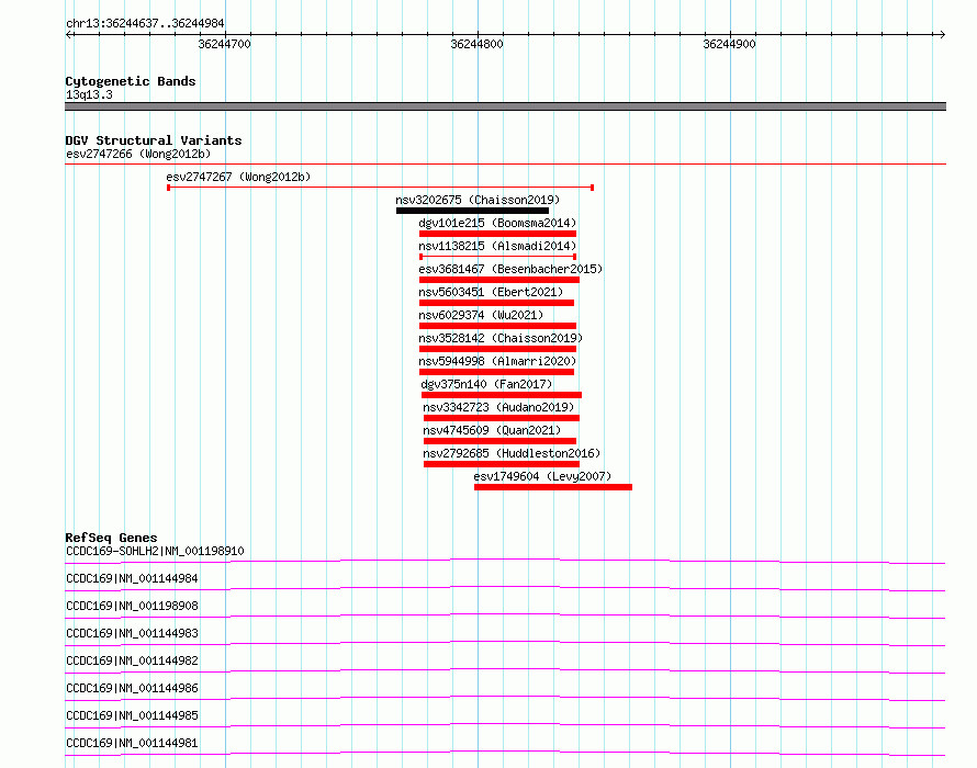 | | Variant Type | CNV deletion | | Copy Number | | | Allele State | | | Allele Origin | | | Probe Count | | | Validation Flag | | | Merged Status | S | | Merged Variants | esv2747266 | | Supporting Variants | | | Samples | SSM079 | | Known Genes | CCDC169, CCDC169-SOHLH2 | | Method | Sequencing | | Analysis | Breakdancer:4 times standard deviation,VariationHunter:4 times standard deviation and at least 3 supportting reads | | Platform | Illumina HiSeq 2000 | | Comments | | | Reference | Wong_et_al_2012b | | Pubmed ID | 23290073 | | Accession Number(s) | essv6823771