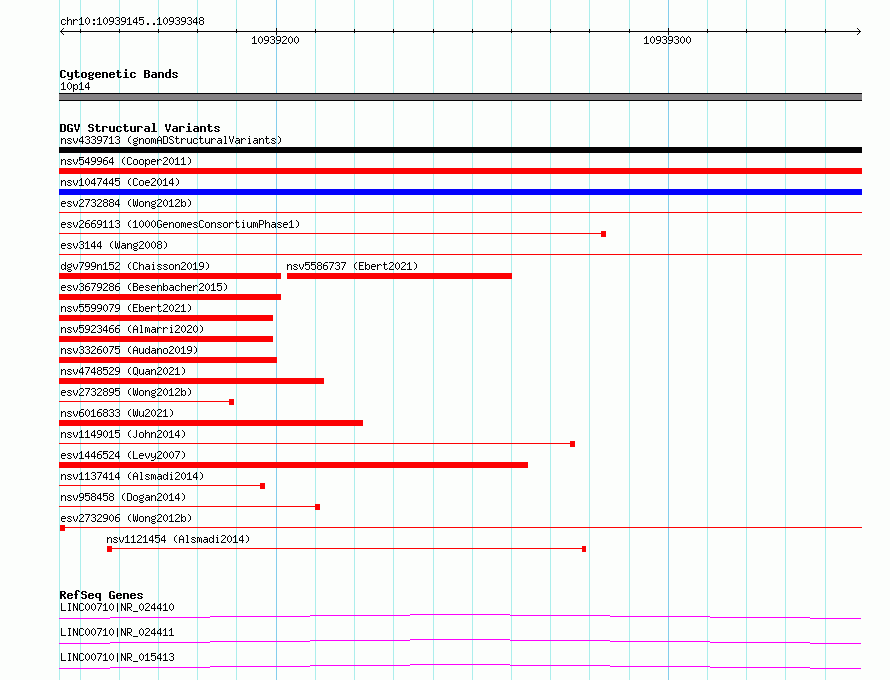 Variant DetailsVariant: essv6827351| Internal ID | 10228099 | | Landmark | | | Location Information | | | Cytoband | 10p14 | | Allele length | | Assembly | Allele length | | hg38 | 204 | | hg19 | 204 |