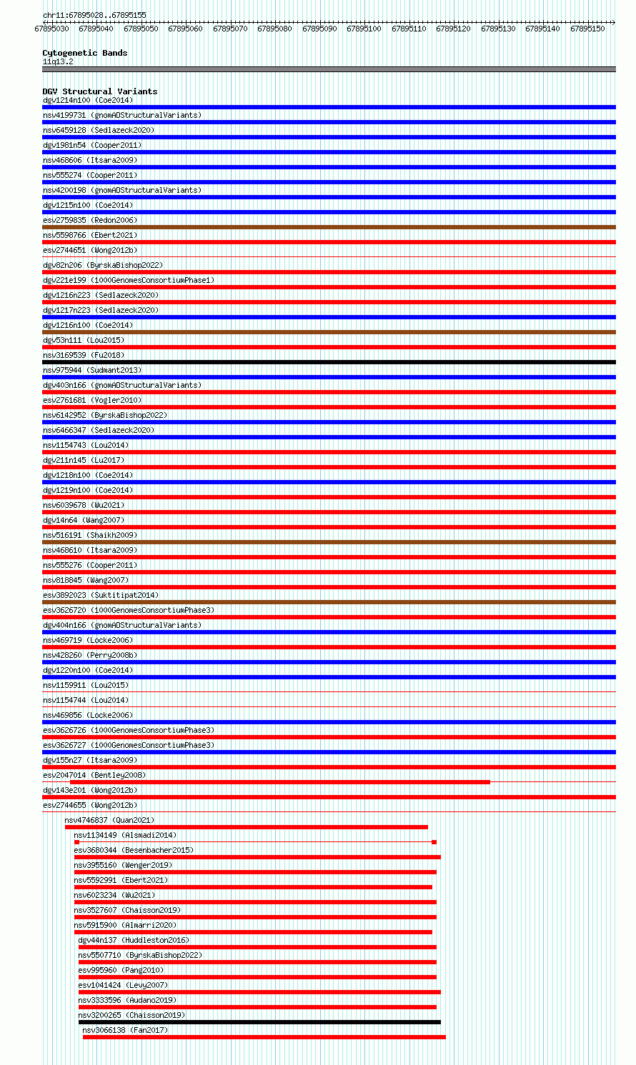 Variant DetailsVariant: essv6827600| Internal ID | 10228321 | | Landmark | | | Location Information | | | Cytoband | 11q13.2 | | Allele length | | Assembly | Allele length | | hg38 | 128 | | hg19 | 128 |