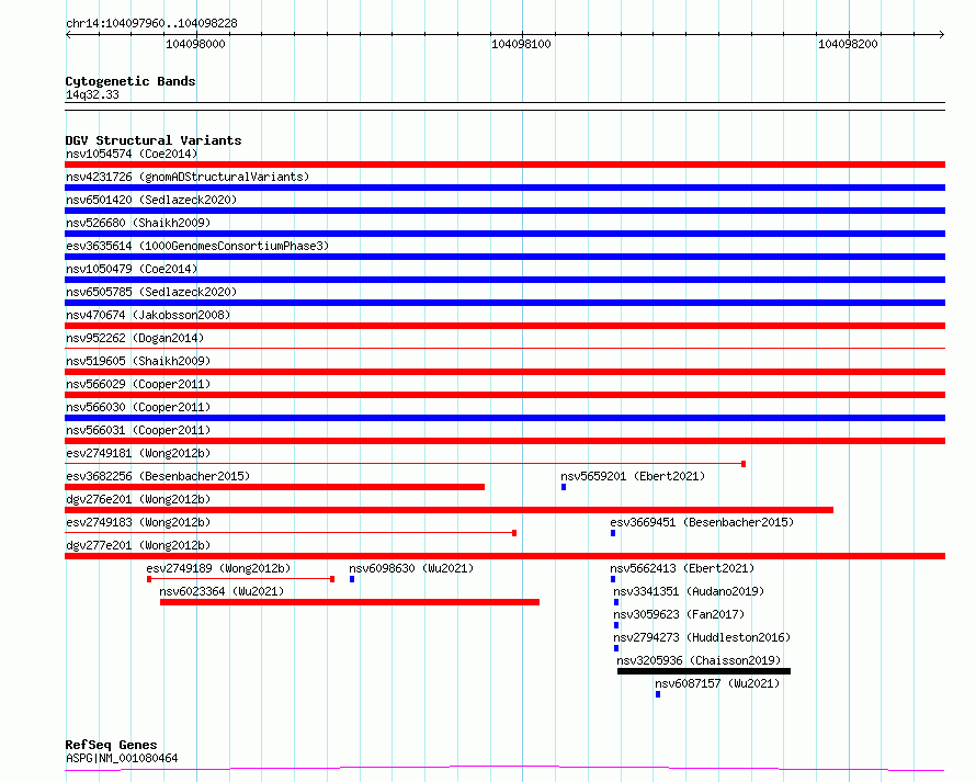| | Variant Type | CNV deletion | | Copy Number | | | Allele State | | | Allele Origin | | | Probe Count | | | Validation Flag | | | Merged Status | S | | Merged Variants | esv2749182, esv2749188, esv2749186, esv2749184, esv2749187 | | Supporting Variants | | | Samples | SSM080 | | Known Genes | ASPG | | Method | Sequencing | | Analysis | Breakdancer:4 times standard deviation,VariationHunter:4 times standard deviation and at least 3 supportting reads | | Platform | Illumina HiSeq 2000 | | Comments | | | Reference | Wong_et_al_2012b | | Pubmed ID | 23290073 | | Accession Number(s) | essv6828036
