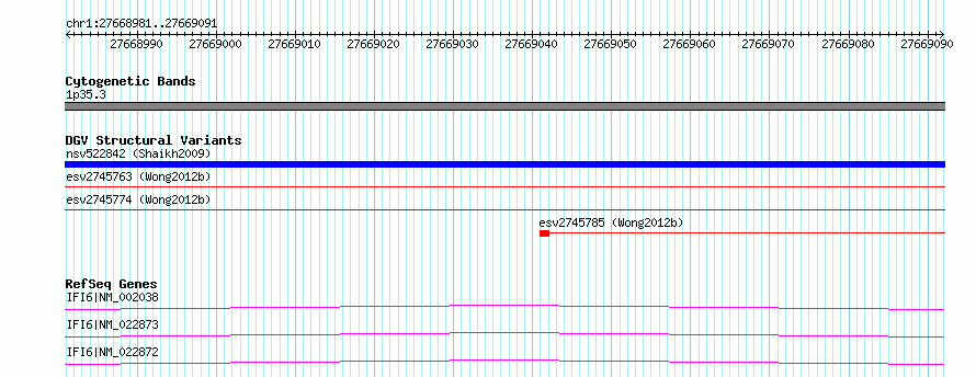 | Variant Type | CNV deletion | Copy Number | | Allele State | | Allele Origin | | Probe Count | | Validation Flag | | Merged Status | S | Merged Variants | esv2745763, esv2745774 | Supporting Variants | | Samples | SSM081 | Known Genes | IFI6 | Method | Sequencing | Analysis | Breakdancer:4 times standard deviation,VariationHunter:4 times standard deviation and at least 3 supportting reads | Platform | Illumina HiSeq 2000 | Comments | | Reference | Wong_et_al_2012b | Pubmed ID | 23290073 | Accession Number(s) | essv6829025