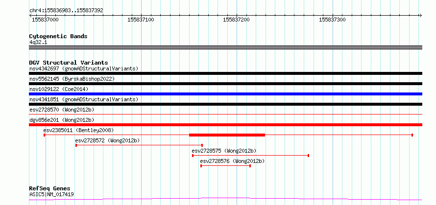 | | Variant Type | CNV deletion | | Copy Number | | | Allele State | | | Allele Origin | | | Probe Count | | | Validation Flag | | | Merged Status | S | | Merged Variants | esv2728570, esv2728571 | | Supporting Variants | | | Samples | SSM081 | | Known Genes | ASIC5 | | Method | Sequencing | | Analysis | Breakdancer:4 times standard deviation,VariationHunter:4 times standard deviation and at least 3 supportting reads | | Platform | Illumina HiSeq 2000 | | Comments | | | Reference | Wong_et_al_2012b | | Pubmed ID | 23290073 | | Accession Number(s) | essv6829817