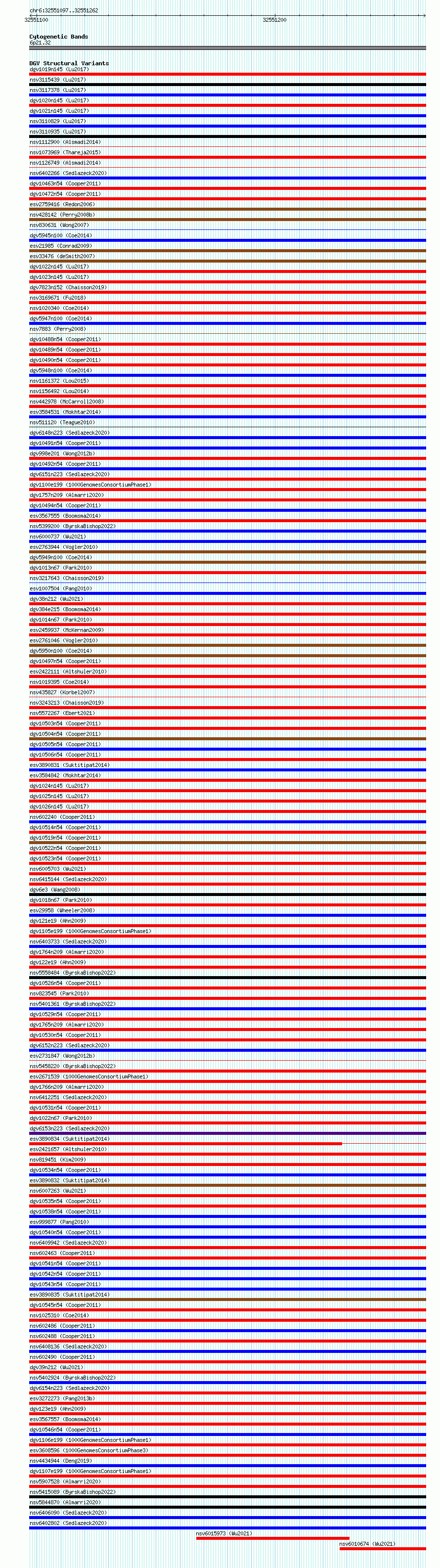 Variant DetailsVariant: essv6830161| Internal ID | 10230627 | | Landmark | | | Location Information | | | Cytoband | 6p21.32 | | Allele length | | Assembly | Allele length | | hg38 | 166 | | hg19 | 166 |