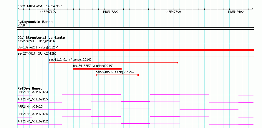 | | Variant Type | CNV deletion | | Copy Number | | | Allele State | | | Allele Origin | | | Probe Count | | | Validation Flag | | | Merged Status | S | | Merged Variants | esv2740588, esv2740589 | | Supporting Variants | | | Samples | SSM081 | | Known Genes | AFF2 | | Method | Sequencing | | Analysis | Breakdancer:4 times standard deviation,VariationHunter:4 times standard deviation and at least 3 supportting reads | | Platform | Illumina HiSeq 2000 | | Comments | | | Reference | Wong_et_al_2012b | | Pubmed ID | 23290073 | | Accession Number(s) | essv6830684